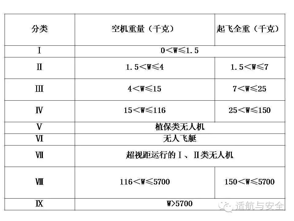 本章補(bǔ)充了適用無人的分類。該分類與AC-91-FS-2015-31《輕小型無人機(jī)運(yùn)行規(guī)定(試行)》的無人機(jī)分類是一致的。如下所示: