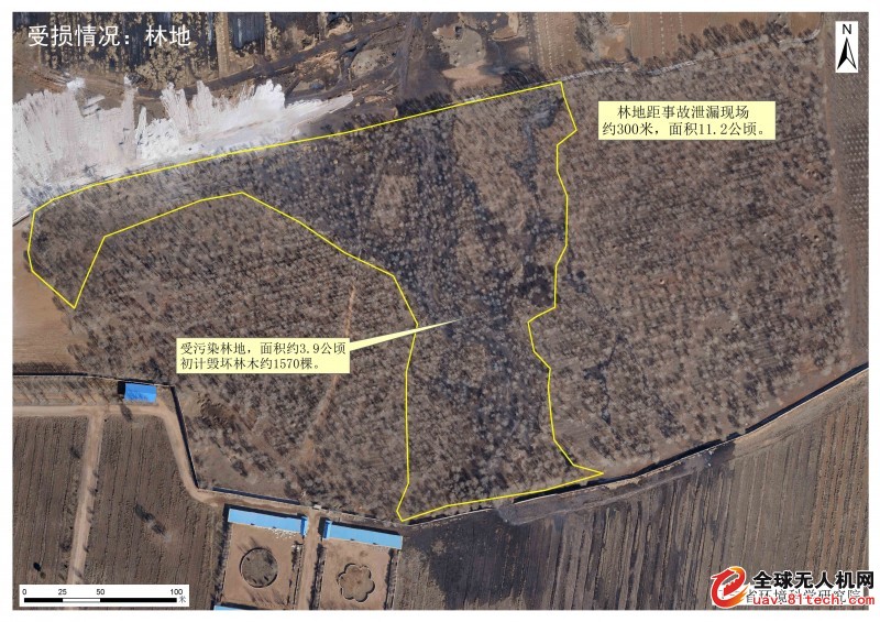 2013年3月受遼寧省環(huán)保廳應(yīng)急處委托對(duì)建平縣黑水鎮(zhèn)鴻燊有限公司硫酸罐倒塌硫酸泄漏事故進(jìn)行應(yīng)急航拍,并對(duì)受污染區(qū)域進(jìn)行分類(lèi)統(tǒng)計(jì)及綜合評(píng)估。